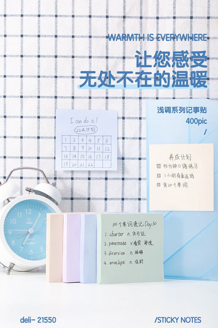 得力(deli)400张4色浅调系列淡彩简约便利贴 粘性强书写顺滑76*76mm便签本/记事贴 办公用品