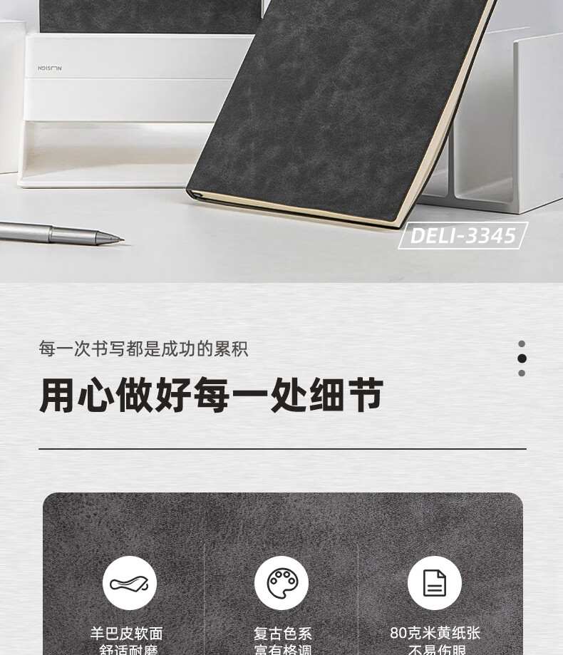 商品名称:得力(deli)16K/120张羊巴皮笔记本子 加厚软面皮面本记事本日记本办公用品 灰色3345