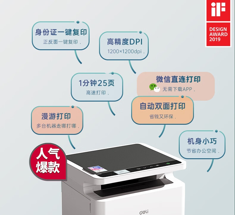 商品名称:得力(deli)M2020DW黑白三合一多功能打印机复印机扫描机一体机 A4办公商用 家用学习手机 自动双面激光打印机